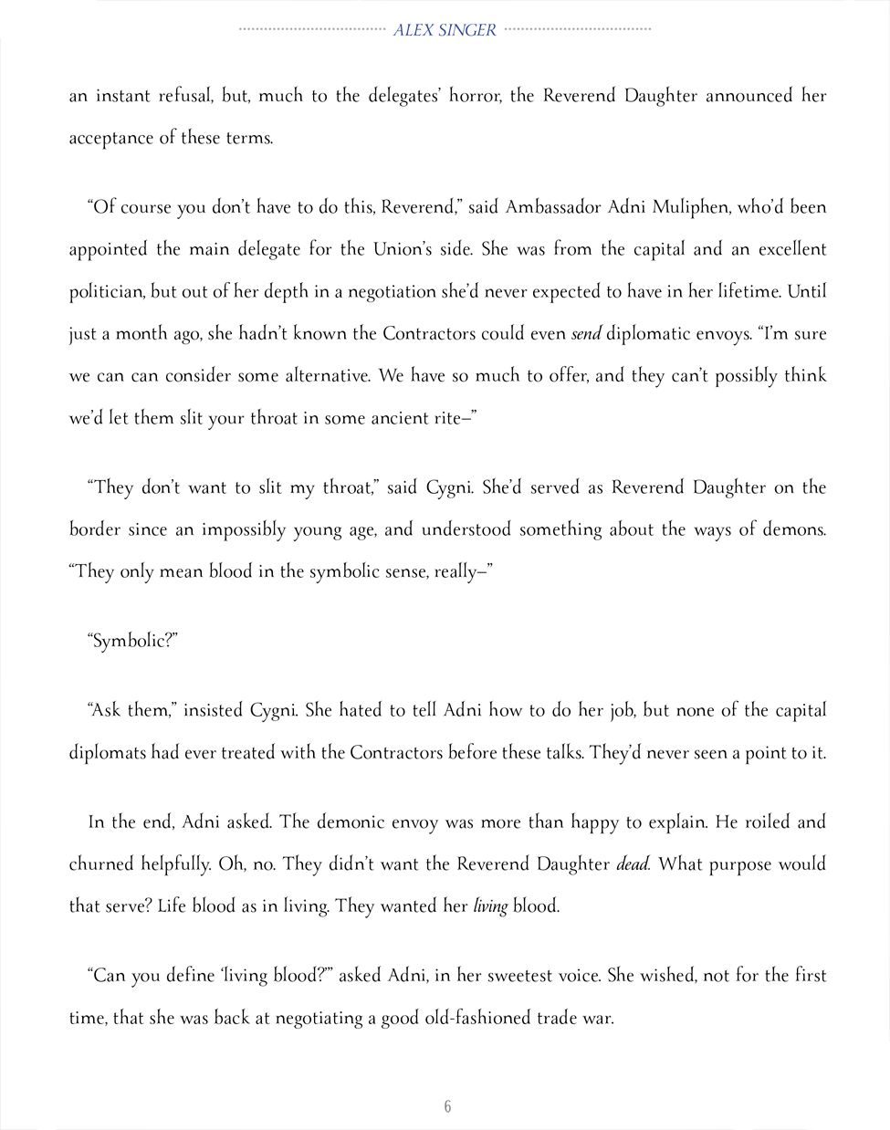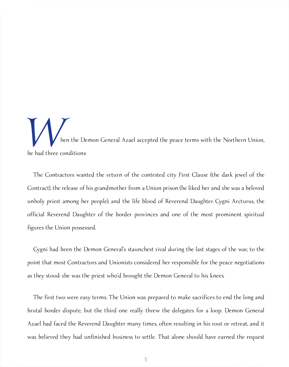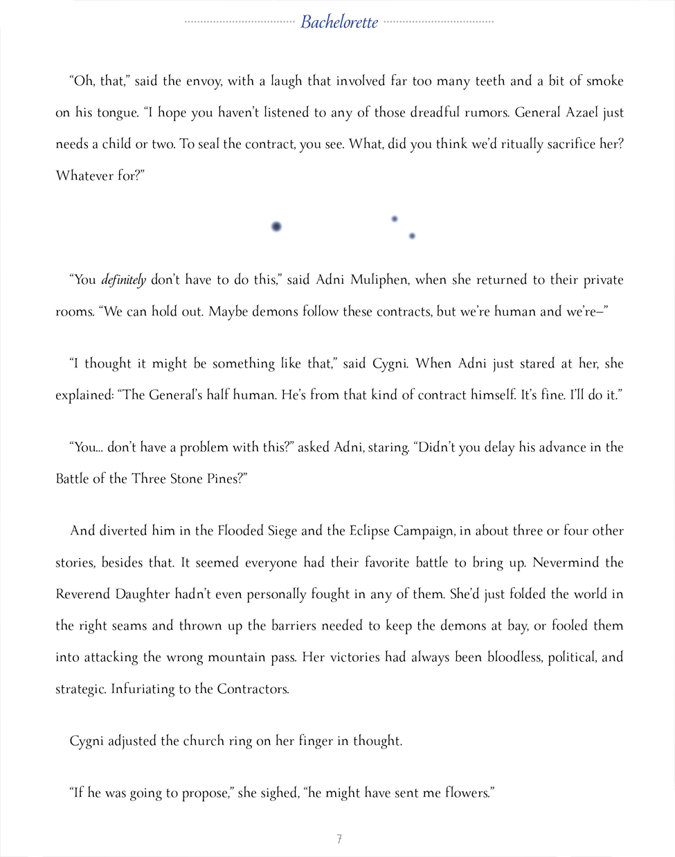 As part of diplomatic terms of peace to an ugly hundred-year war, the Demon General Azael demands marriage of his longtime enemy: the Reverend Daughter Cygni.