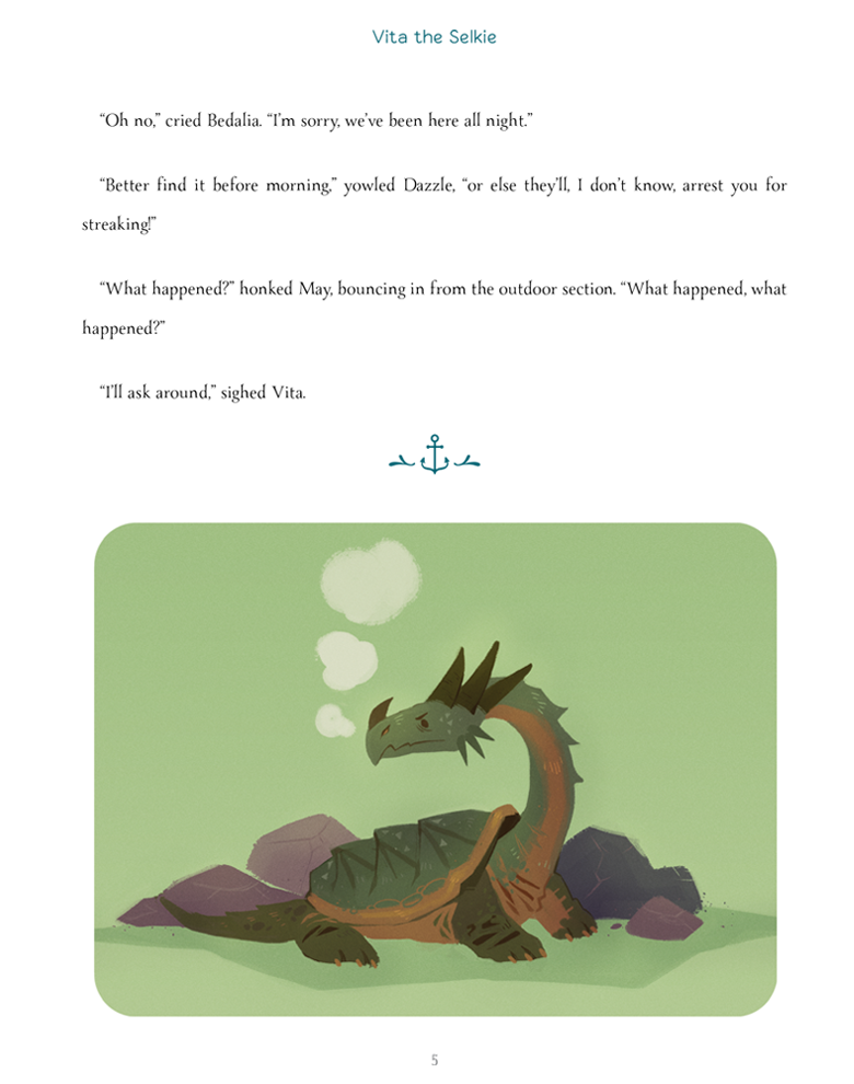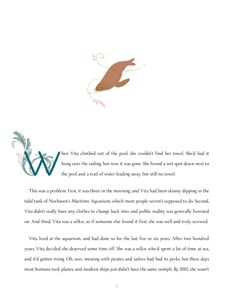 Vita is a selkie who has retired from her days being a mythical menace at sea and now resides at a local aquarium. One night she finds herself in a dilemma: she lost her magical cloth, and she must find it or risk being discovered in human form (and very nude) by the morning staff. She asks around the aquarium in search for it.